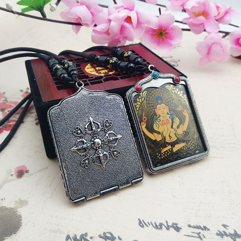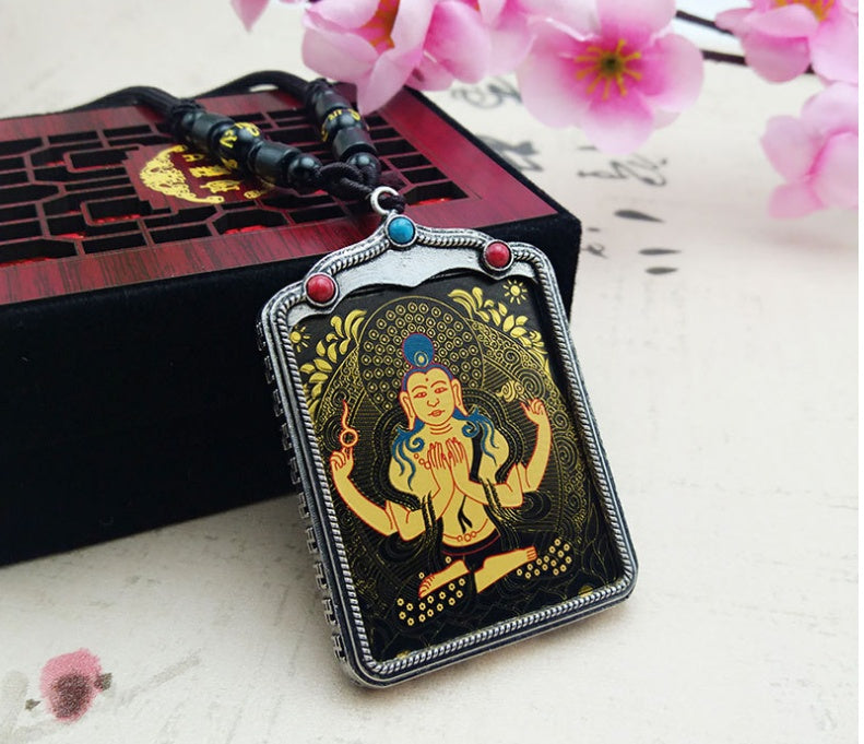 Product information Product Name: Thangka Pendant Style: Four-armed Guanyin, Sakyamuni Buddha Size: width 46* height 68mm* thickness 6mm Weight: about 48 grams (including rope weight) Chain circumference: 68cm Material: Alloy Process: Electroplating Note: The marked price includes rope, delivery certificate If you need a box or bag, please contact the...
